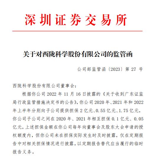 具体来看,监管函指出,根据西陇科学2022年11月16日披露的《关于收到广东证监局行政监管措施决定书的公告》,公司2020年、2021年和2022年上半年分别向子公司提供担保2亿元、0.55亿元、1.75亿元,公司子公司之间在2020年、2021年相互担保0.1亿元、0.05亿元,相关担保金额在公司每年向董事会及股东大会申请的授权额度内,但西陇科学未在担保实际发生时及时披露,仅在定期报告中对相关担保情况进行披露,以定期报告替代应当履行的临时报告义务。