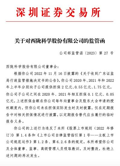 3月13日,西陇科学股份有限公司(以下简称“西陇科学”)收到深交所向其发出的监管函。监管函称,西陇科学未在担保实际发生时及时披露,仅在定期报告中对相关担保情况进行披露,以定期报告替代应当履行的临时报告义务。此举违反了深交所相关规定。
