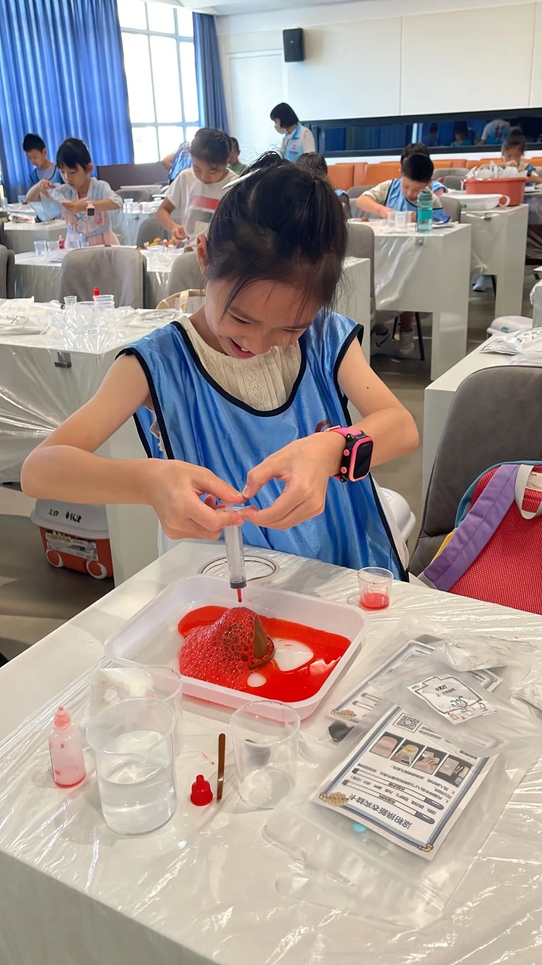 当看到开始发生化学反应冒出来的红色泡泡时,小朋友们都发出“哇,好神奇”,“成功啦”的惊叹声,并与老师和小伙伴分享自己兴奋的心情,意犹未尽。