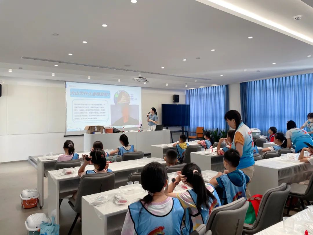 实验开始前,老师先给小朋友们“热热身”,播放了一段火山爆发的视频,再告诉大家什么是火山、火山为什么会爆发等知识。正式进入“火山爆发”实验时,老师给大家讲解了实验的过程、注意事项、实验原理,小朋友们聚精会神地倾听,有条不紊地按照步骤进行。