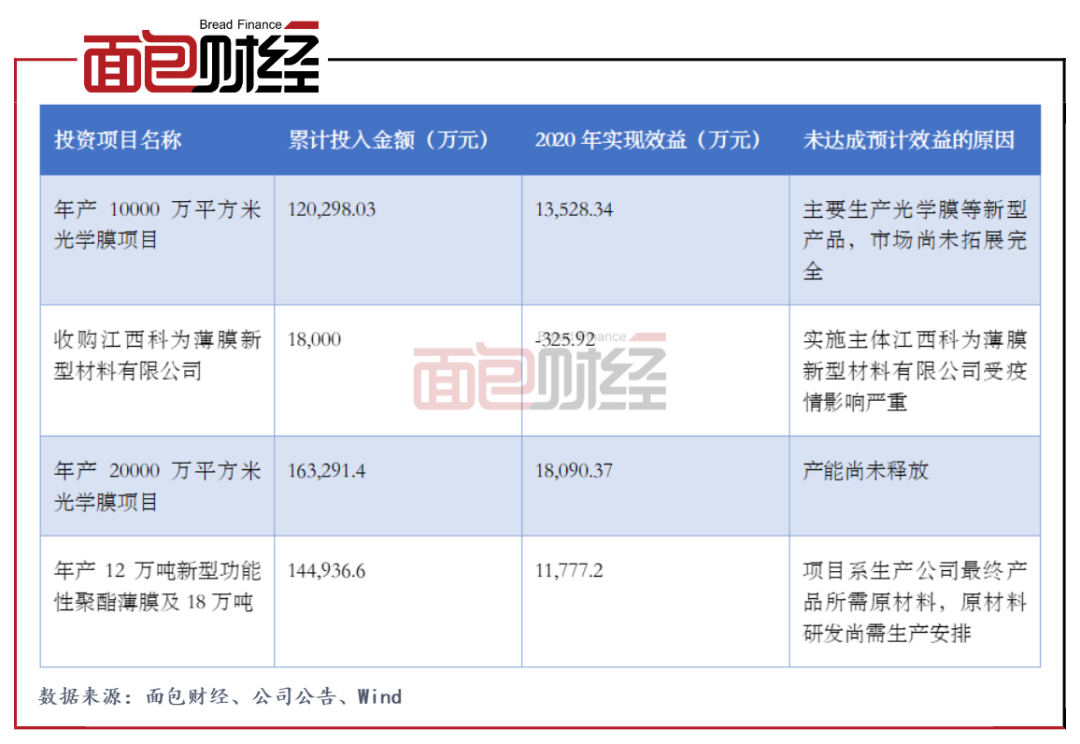 2021年4月,双星新材公告称其使用募集资金投资建设的年产2亿平米光学膜项目(30万吨高功能膜材料)产线已安装完毕、投料试车。公司称项目投产后,公司膜材料的整体产能预计提升逾四成。然而研究公司2020年年报可知,其多项投资项目建成投产后未能达到预计效益,2亿平米光学膜项目投产后的业绩表现能否令人满意尚存疑。