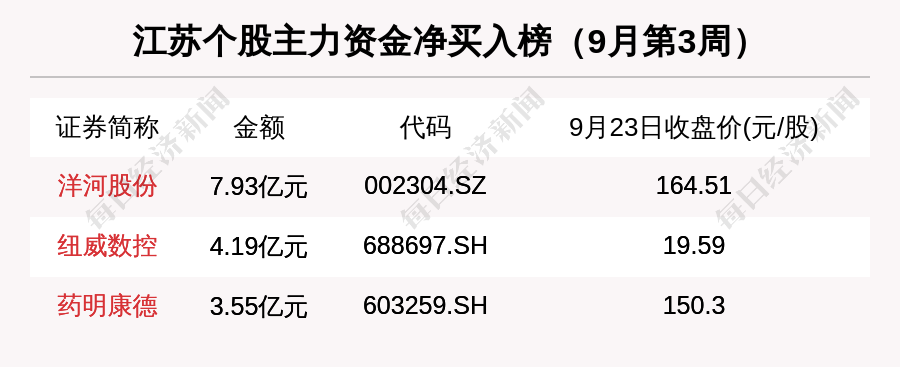主力资金方面,9月第3周,洋河股份净买入额居首位,为7.93亿元,其次是纽威数控(4.19亿元)和药明康德(3.55亿元)。
