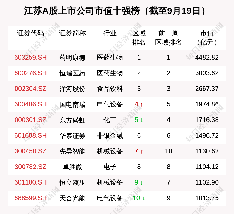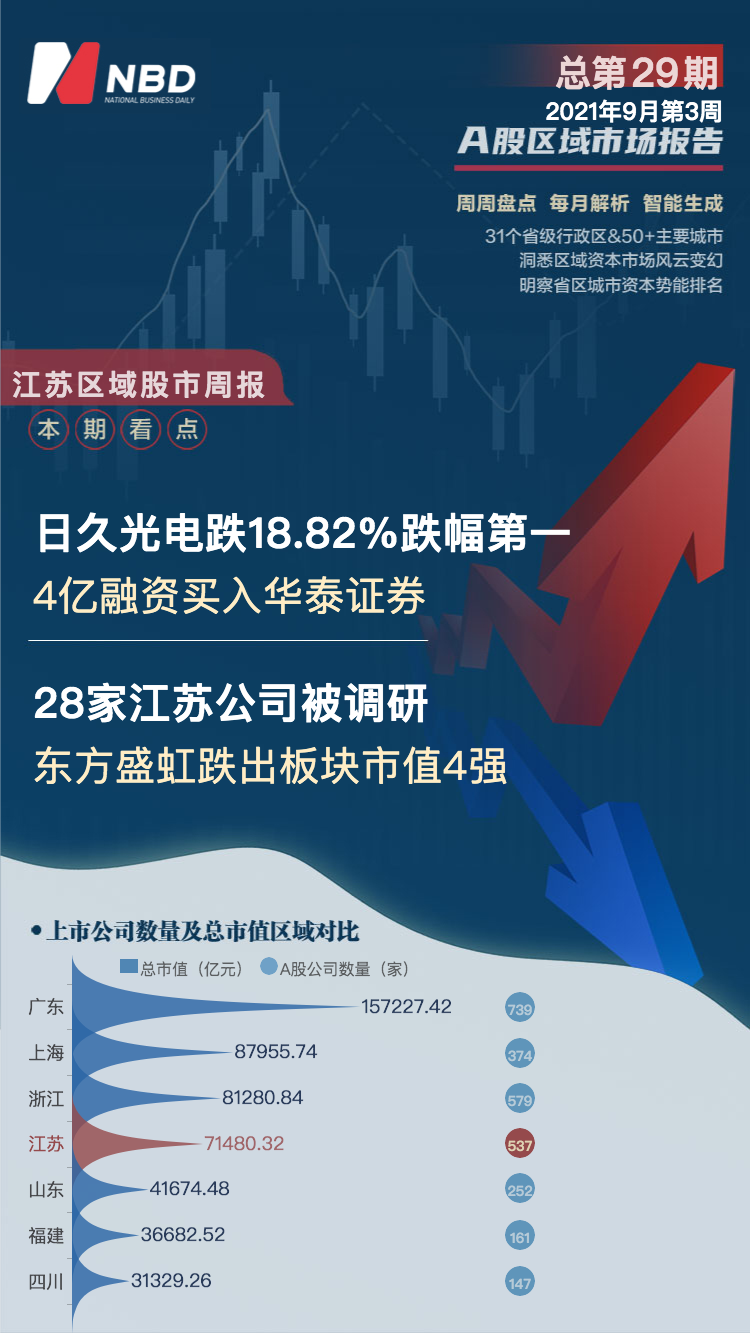 涨跌幅方面,截至2021年9月19日,江苏板块市值与前一周相比,区间涨幅为-1.17%(加权平均值),涨幅排名全国第14位。