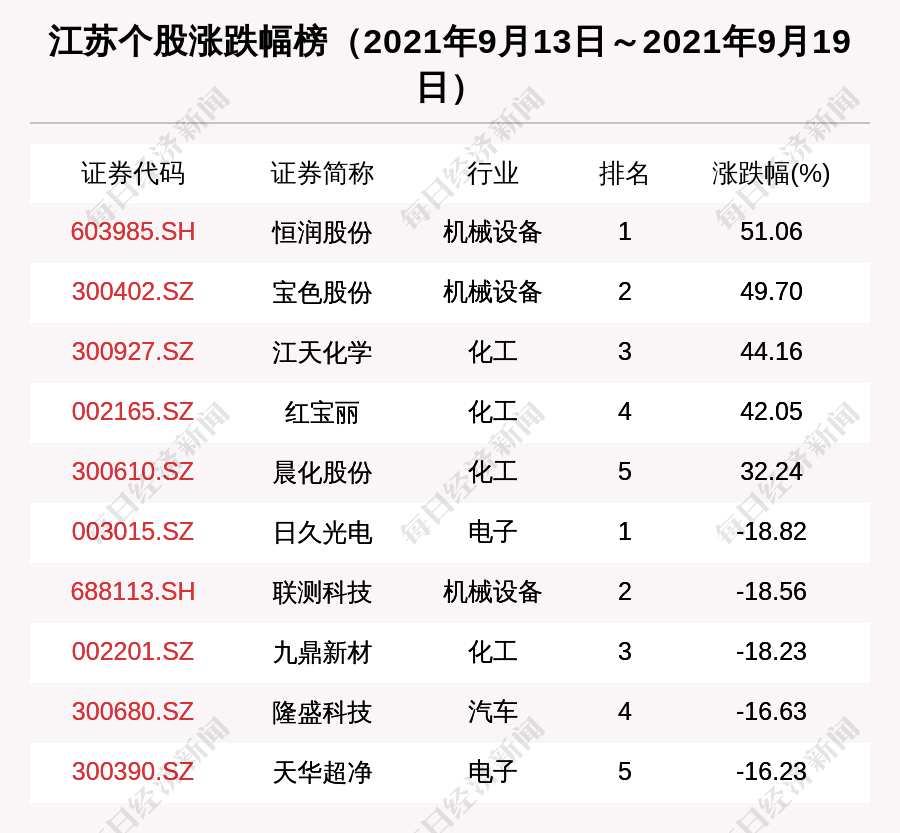 从涨跌幅来看,上周涨幅最大的江苏公司是恒润股份,上涨幅度为51.06%。跌幅最大的是日久光电,下跌幅度为18.82%。