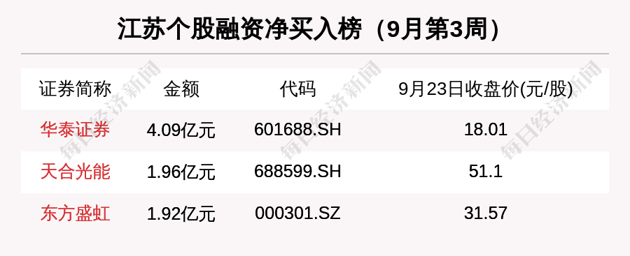 先看融资资金,9月第3周,江苏板块融资净买入总额为18.31亿元。融资净买入最多的江苏股是华泰证券,金额是4.09亿元。其次是天合光能(1.96亿元)和东方盛虹(1.92亿元)。