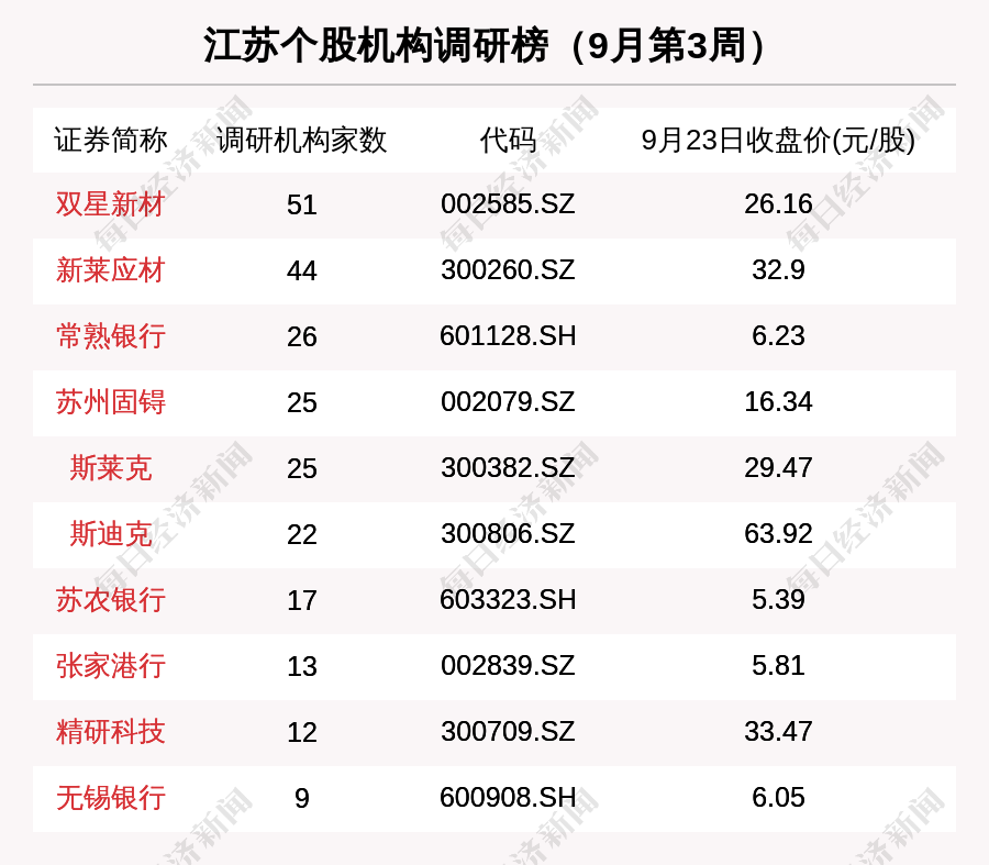 机构调研方面,据数据统计,9月第3周,有28家江苏上市公司接受机构调研。其中,51家机构到访双星新材,44家机构到访新莱应材,26家机构到访常熟银行,25家机构到访苏州固锝,25家机构到访斯莱克。