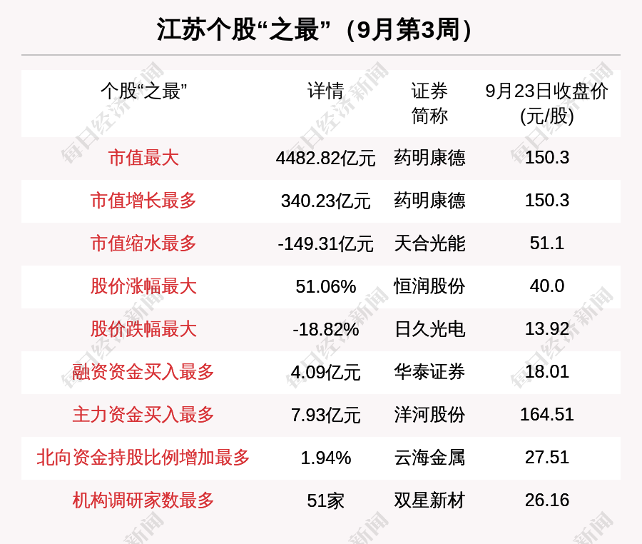 9月第3周(2021年9月13日~2021年9月19日),江苏股中,药明康德市值增长最多;天合光能市值缩水最多;涨幅最大的是恒润股份,上涨幅度为51.06%;跌幅最大的是日久光电。此外,航发控制被3家机构调研,且同时被主力资金,融资资金看好。