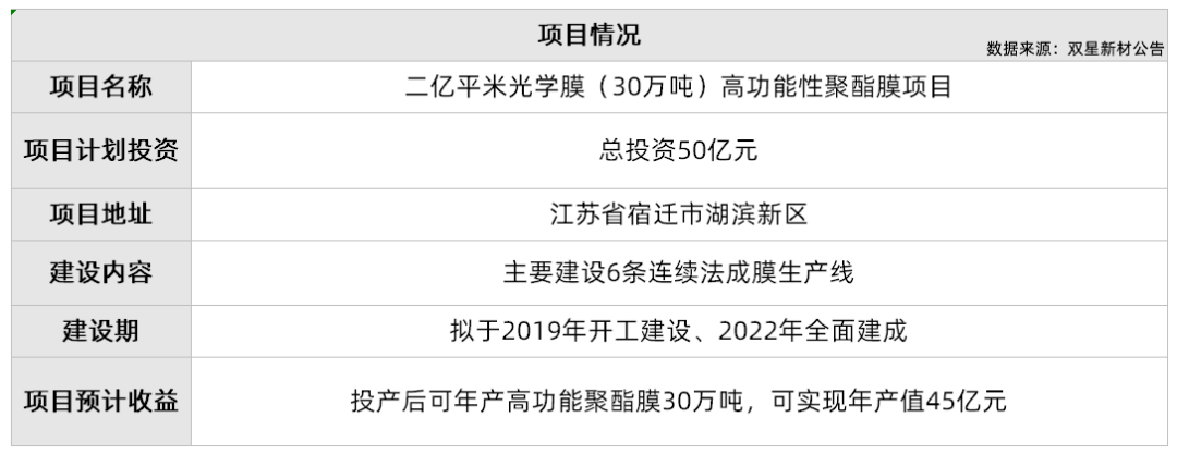 该项目拟于2019年开工建设、2022年全面建成,投产后可年产高功能聚酯膜30万吨,可实现年产值45亿元。