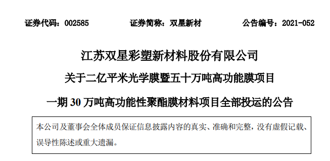 12月17日,双星新材发布公告,公告称为进一步延伸光学材料产业链,加速“五大板块”新材料成长,投资建设“二亿平米光学膜暨五十万吨高功能膜项目”。目前一期的“30 万吨高功能性聚酯膜材料项目”年内6条产线已陆续全部安装调试完毕,并全面投运。