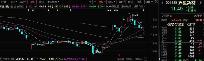 截至7月14日上午11:11,双星新材报11.49元/股,跌幅为3.28%。
