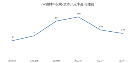 此外,资本支出与折旧摊销的比值在一定程度上代表了行业去产能的晴雨表。根据WIND统计数据,2024年上半年膜材料板块资本支出与折旧摊销之比为1.78,相较上年同期有所下滑,在一定程度上也体现出行业产能释放已进入尾声。