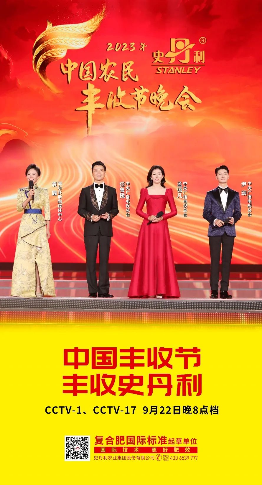 金色丰收,共庆盛典。9月22日晚8点档,《2023年中国农民丰收节晚会》将在总台央视综合频道(CCTV-1)、农业农村频道(CCTV-17)播出。在这个喜庆的日子里,史丹利向全国农民朋友表示崇高的敬意,共享丰收的喜悦!
