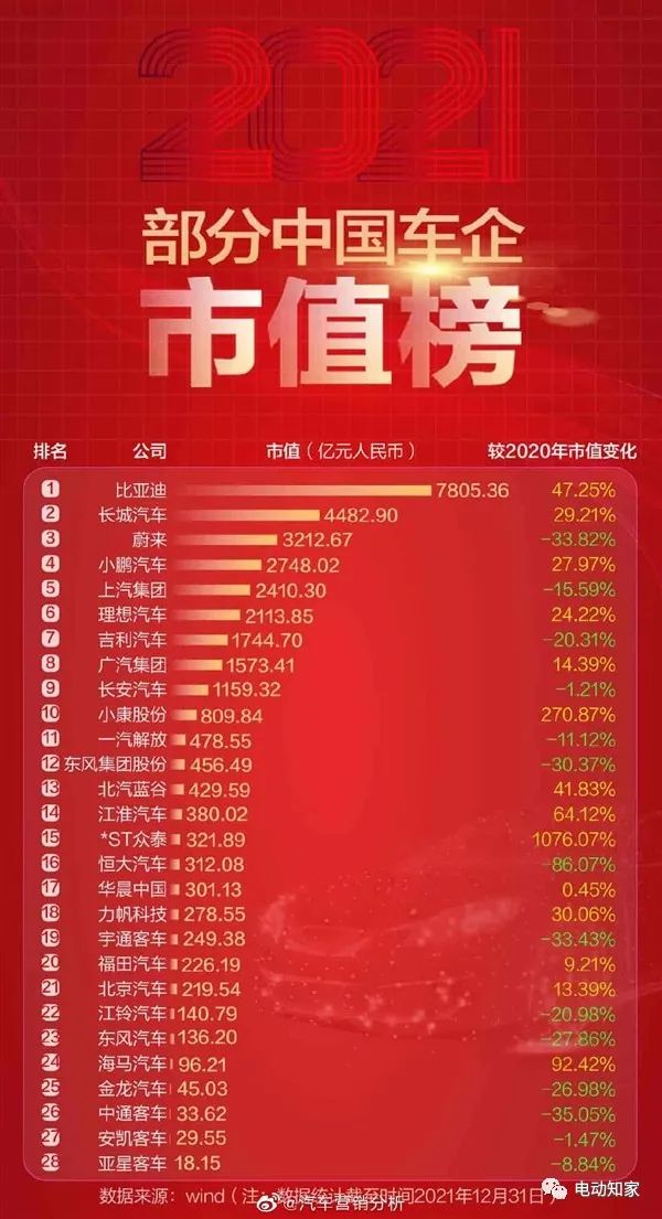 电动知家消息,近日,2021年部分中国车企市值榜公布。据统计数据显示,截至2021年12月31日,比亚迪以7805.36亿元人民币的市场荣登榜首,总市值同比增长47.25%,比位于第二、第三位的长城和蔚来总和还要多。