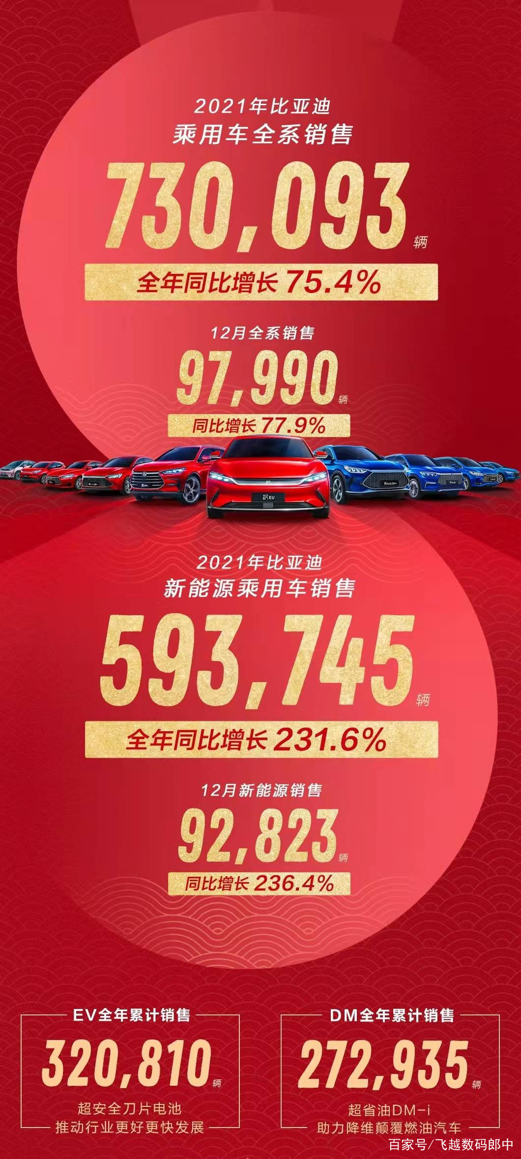 大家比较熟悉的比亚迪,在2021年全年销量达到730093,同比增长75.4%;新能源乘用车全年销量接近60万,同比增长231.6%、达593745。这也是截止至目前的中国新纪录,是此前的中国纪录的2.4倍,一度成为了21年高频次出现的新能源车企词汇,影响诸多圈层,而在12月,比亚迪乘用车全系销售97990辆,其中新能源乘用车同比暴涨236.4%、达92823,连续两个月突破9万辆大关,这样的数据确实让人意外,同时也说明比亚迪已逐渐成为当下用户心中的购买意向。