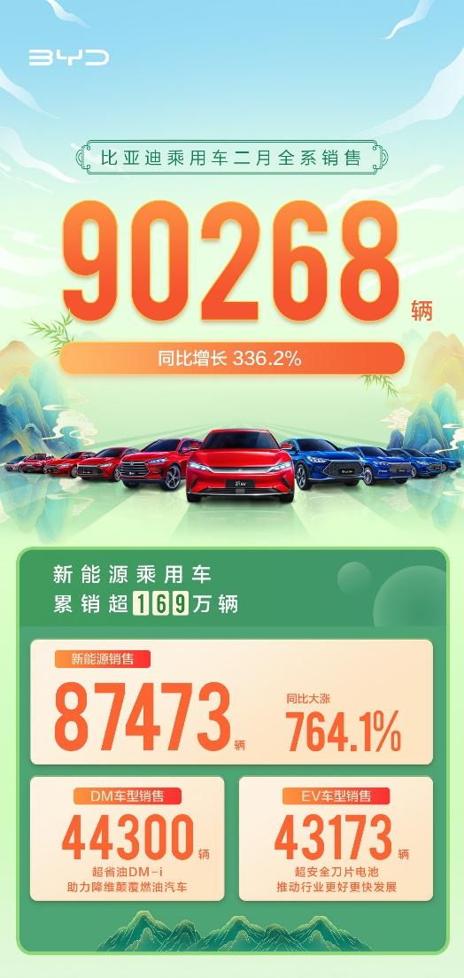 最近国际社会动荡,国产品牌备受关注,比亚迪作为国产新能源汽车的零跑者,2月份的销量有不错惊喜:比亚迪2月全系乘用车卖了90268辆,新能源车卖了87473辆。全系同比增长336.2%,性能源车同比增长764.1%,这是一个非常大的增长量。而且在新能源车中,DM车型占了44300辆,EV车型占了43173辆。