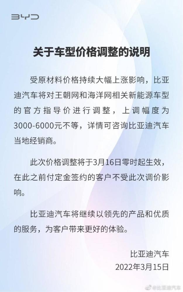 3月15日,比亚迪汽车官方宣布,受原材料价格持续大幅上涨影响,将对王朝网和海洋网相关新能源车型的官方指导价进行调整,上调幅度为 3000-6000 元不等,此次价格调整将于3月16日零时起生效。