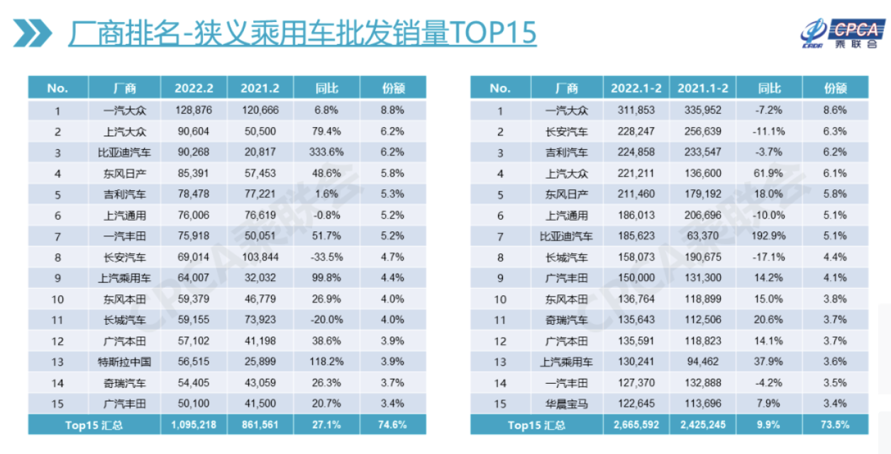 从2月整体的产销量来看,已经有部分自主车企出现颓势,最为明显的就是长城、吉利、长安自主三强,2月份吉利的增幅仅有1.6%,为7.8万辆;而长安和长城同比下跌分布为33.5%和20%,单月销量分别为6.9万辆和5.9万辆。因此,长安取得了车企第八的成绩,而长城汽车跌出前十。