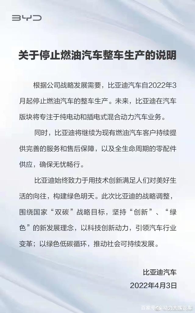 4月3日晚间,比亚迪正式发布公告:“根据公司战略发展需要,自2022年3月起停止燃油汽车的整车生产。未来,该公司在汽车版块将专注于纯电动和插电式混合动力汽车业务。”