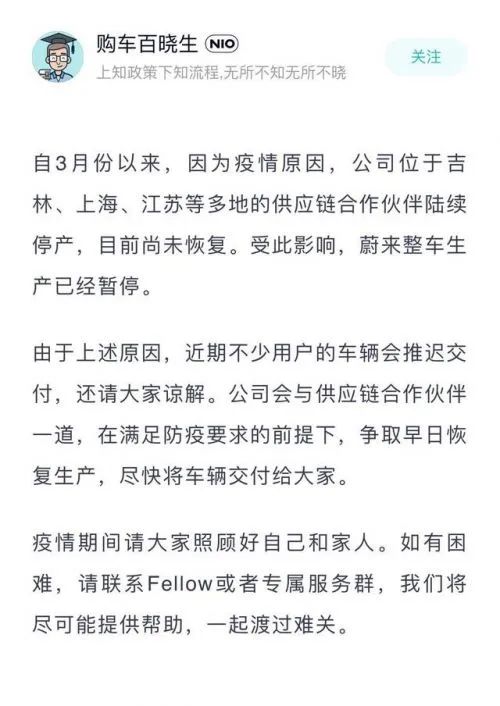 实际上,目前已有不少车企受到影响。蔚来汽车近日称,自3月以来,因为疫情原因,公司位于吉林、上海、江苏等多地的供应链合作伙伴陆续停产,目前尚未恢复。受此影响,蔚来整车生产已经暂停。而由于上述原因,近期不少用户的车辆会推迟交付。