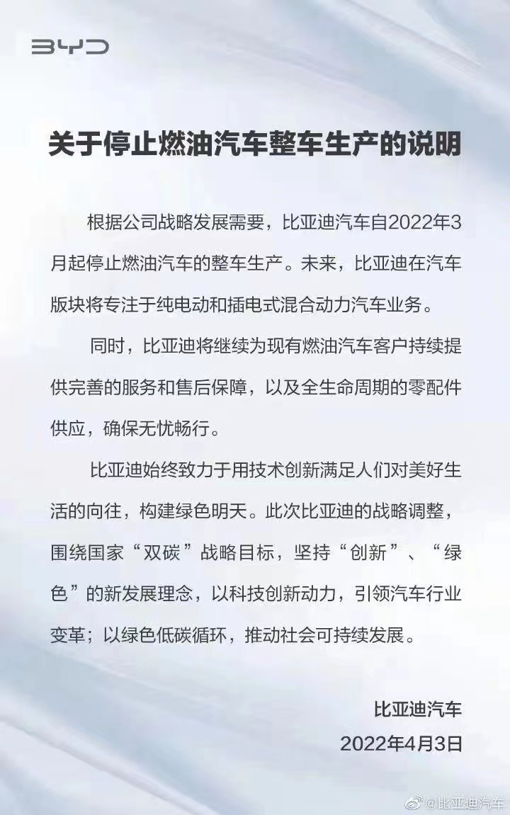 比亚迪停止燃油车整车生产;图片来源:比亚迪