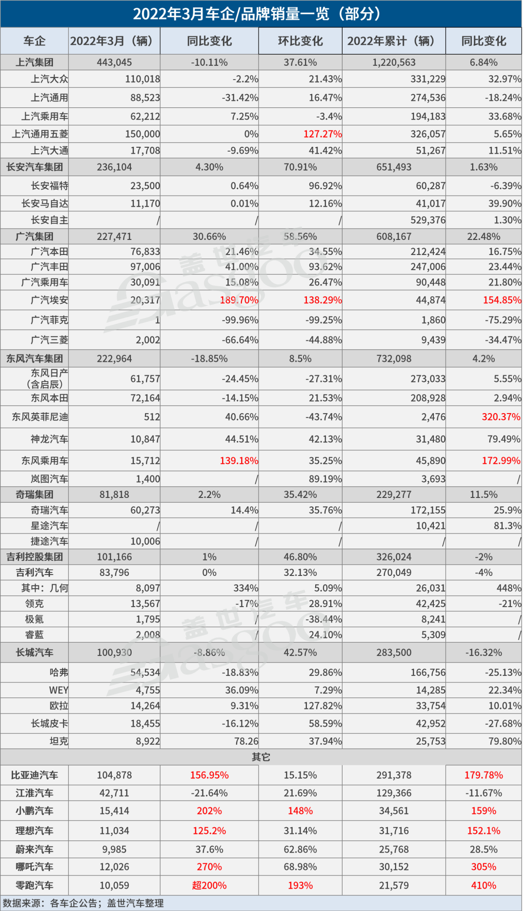 近日,多家车企/品牌陆续公布3月汽车销量。从盖世汽车汇总的数据来看,绝大多数车企环比上涨,不过受疫情扩散等因素影响,不少车企同比表现不及预期。