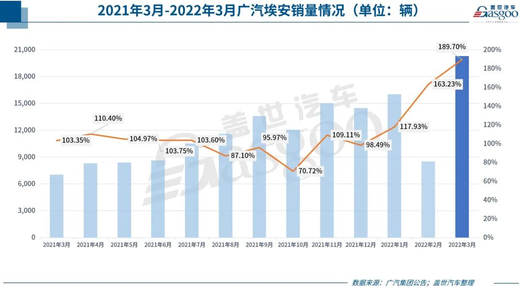 就广汽集团而言,广汽埃安的贡献度正在逐步增强。在经历2月的短暂下跌后,3月广汽埃安销量大幅回暖,首破两万辆,达20,317辆,同比暴增189.7%,环比增长138.3%。其中仅AION Y,3月就交付了9,501辆,环比增长218%。