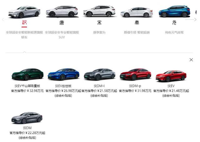 汉家族产品序列中,从宏观角度来看主要是纯电和混动的区别,但为了满足不同的消费人群,汉家族产品序列划分相当细致,我们能从上图中汉家族各成员售价数据看出市场定位的拔高和研发成本逐步走低。