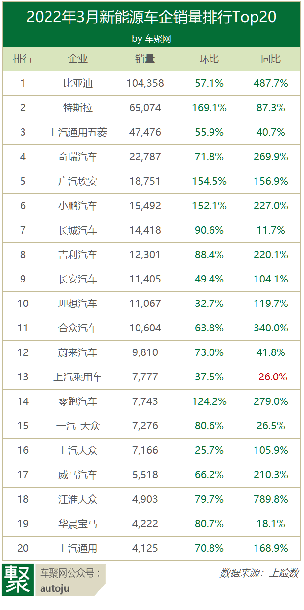 比亚迪蝉联销冠,3月新能源车销售104,358辆,同比增长488%,环比提升57.1%。这是它首次突破10万辆,同时比亚迪成为国内首个“月销10万”的新能源车企。1-3月新能源累计销量近25万辆。