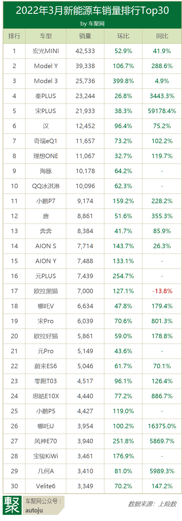 受季末冲量影响,特斯拉3月销量同比增长87.3%、环比增长169%,以65,074辆销量超过五菱位居第二,这一成绩仅次于2021年12月的7万辆。其中,Model Y销售39,338辆,Model 3销售25,736辆,依次位居车型榜第二、第三位。