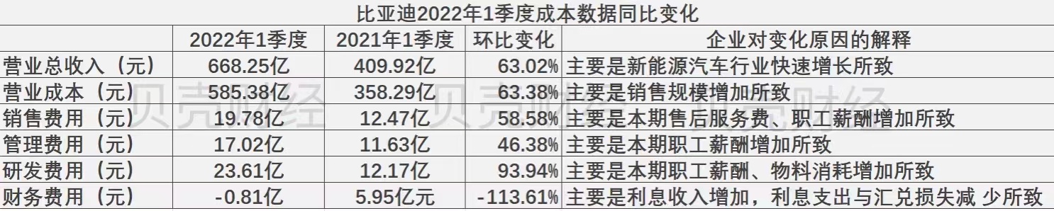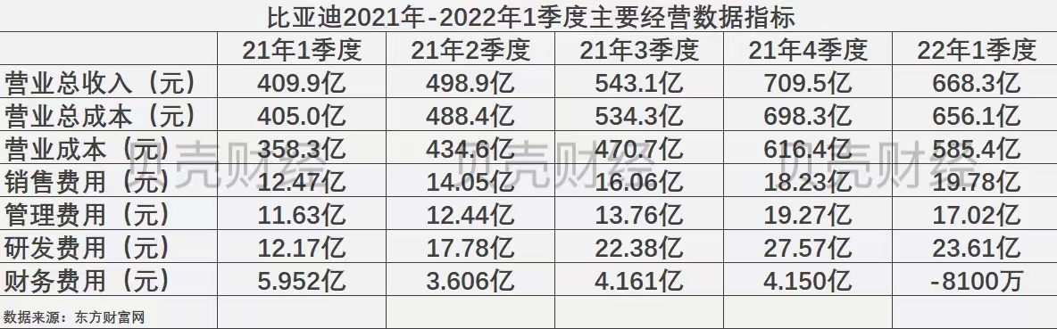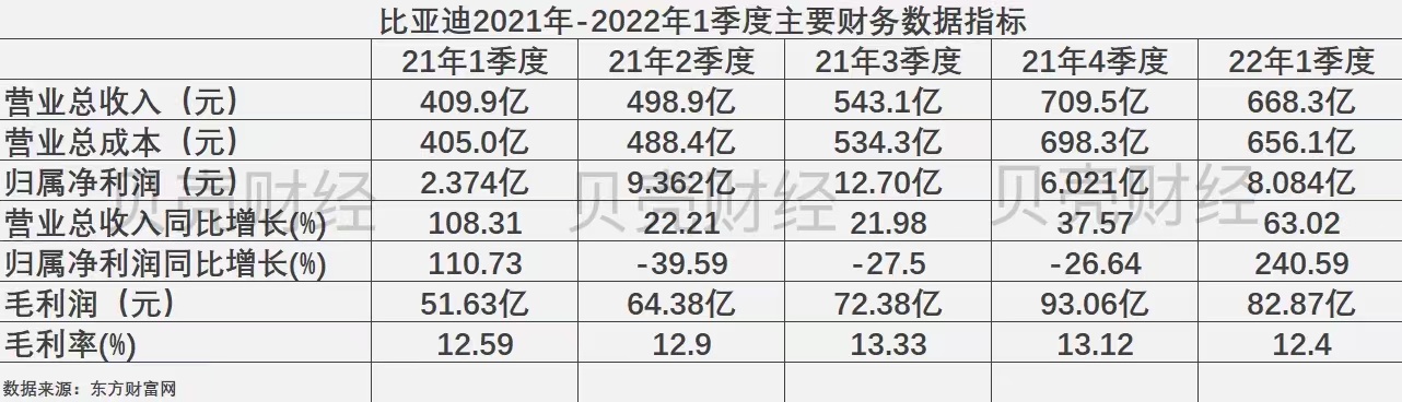 2022年一季度,比亚迪财报披露的财报信息整体表现较为优异。虽然营业总收入环比下滑了5.81%,从去年四季度709亿元下降至今年一季度的668.3亿元,但同比增幅达到了63.02%。