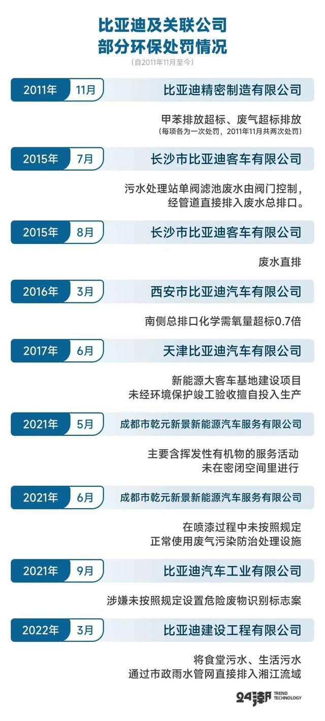 据 24潮不完全统计,2011年11月至今,比亚迪及关联公司约收到相关管理部门 10 次环保处罚,处罚事由涵盖甲苯排放超标、废气超标排放、废水直排等问题。