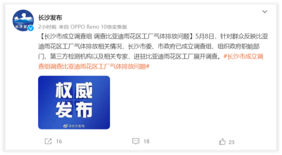 5月8日,针对群众反映比亚迪雨花区工厂气体排放相关情况,长沙市委、市政府已成立调查组,组织政府职能部门、第三方检测机构以及相关专家,进驻比亚迪雨花区工厂展开调查。