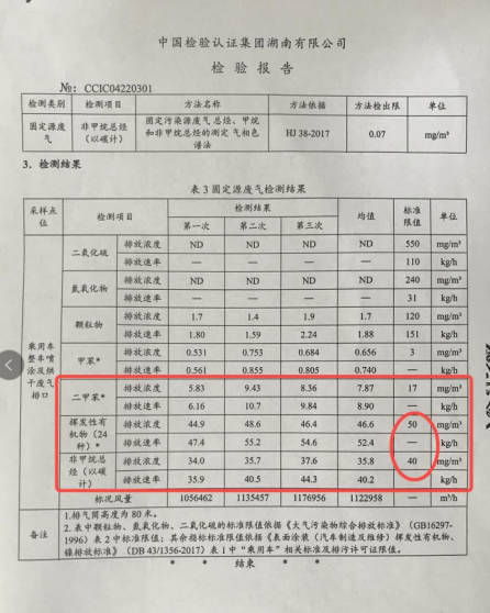 图中显示,该园区有组织排放的挥发性有机物(VOCS)的三次自检数据排放浓度分别为44.9mg/m3、 48.6mg/m3、46.6mg/m3。三次排放浓度已经超过了中华人民共和国核发给比亚迪公司排污许可证的40mg/m3。