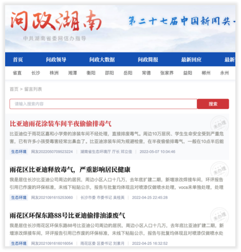 来自湖南中建嘉和城的业主们纷纷反应,自家住宅区附近的比亚迪雨花区工厂排放废气,并且气味十分刺鼻难闻,在“问政湖南”的官网上投诉更比比皆是。
