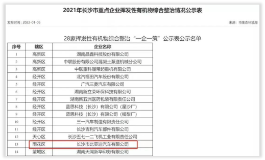 ?2022年1月5日,长沙市生态环境局官网发布了2021年长沙市重点企业挥发性有机物综合整理情况公示表,长沙市比亚迪汽车有限公司赫然在列!