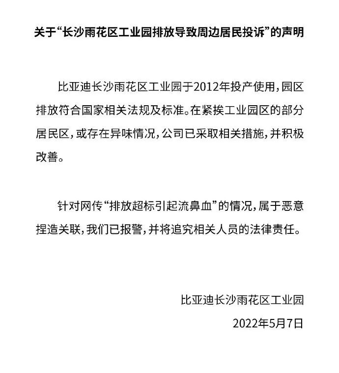 对于网上轰轰烈烈的声讨声,比亚迪官方的回应不可谓不硬气了,5月7日晚间,比亚迪紧急发布《关于“长沙雨花区工业园排放导致周边居民投诉”的声明》。该声明中强调了该园区的排放符合国家相关法规及标准。对于园区附近居民区存在异味的情况,公司也已采取相关措施,并积极改善。