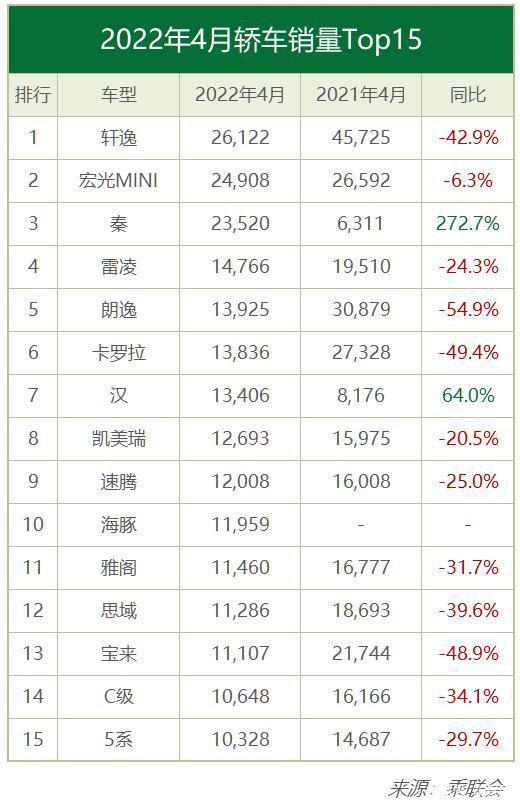 细分市场中,轩逸虽然依旧位居轿车市场销冠,但因疫情影响产能受限,4月销量同比下滑42.9%至26,122辆,仅比第二位的宏光MINI(24,908辆)高出1,200多辆,轿车销冠地位不保。