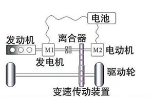 2009年2月,比亚迪自主研发设计并生产的全球首款不依赖专业充电站的双模汽车——F3DM搭载DM 1代混动技术正式上市,没有行星齿轮这类动力分配机构,只有简单的几个离合器,两个电机和1.0升的发动机在一个轴上,这个轴通过减速直接驱动车轮。