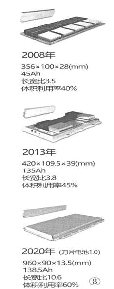 从比亚迪对外公布的数据看来,它的技术迭代思路是坚持将电池做长做薄,电芯尺寸已经超越同期其它电池企业,例如2008年的F3DM电芯尺寸是356*100*28,而欧洲2012年左右出台的标准方形电池尺寸为EV(173*115*45)。