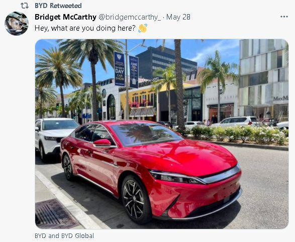 近期,有海外网友在社交平台上放出一张比亚迪(002594)汉EV(参数丨图片)现身美国加州的图片,并且打趣地问道:“Hey, what are you doing here?”。随后,比亚迪官方账号转发了这条推文。