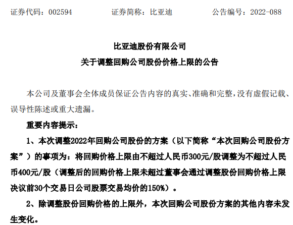 6月8日晚间,比亚迪(SZ002594,股价327.41元,市值9531亿元)发布关于调整回购公司股份价格上限的公告,将回购价格上限由不超过300元/股调整为不超过400元/股。调整后的回购价格上限未超过董事会通过调整股份回购价格上限决议前30个交易日公司股票交易均价的150%。除调整股份回购价格的上限外,本次回购公司股份方案的其他内容未发生变化。