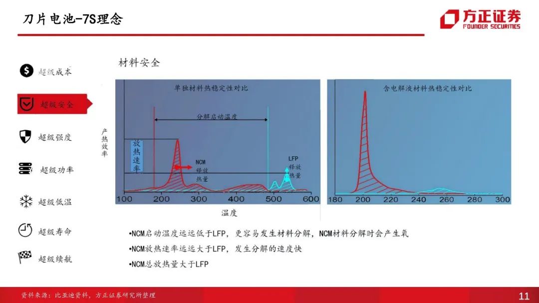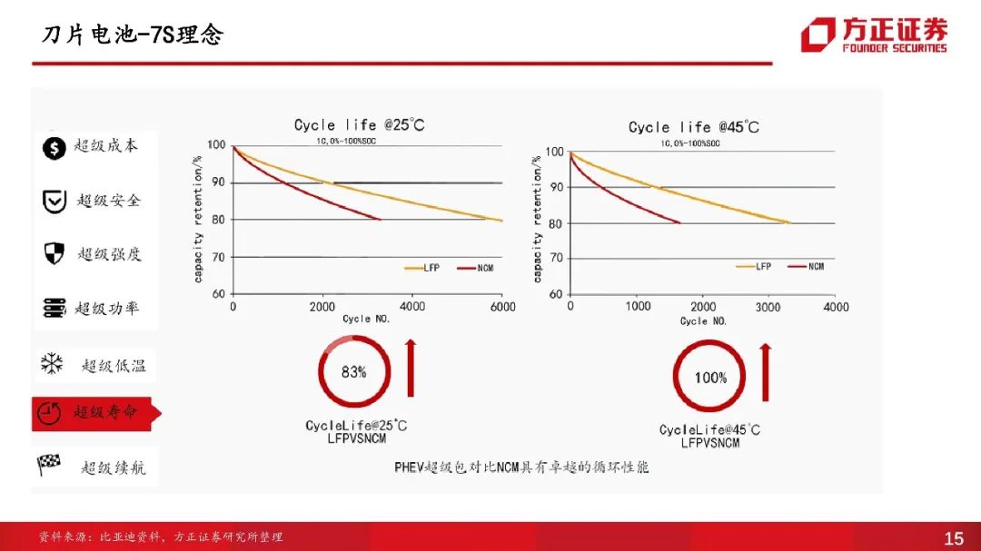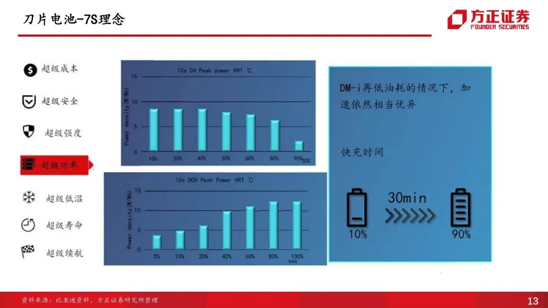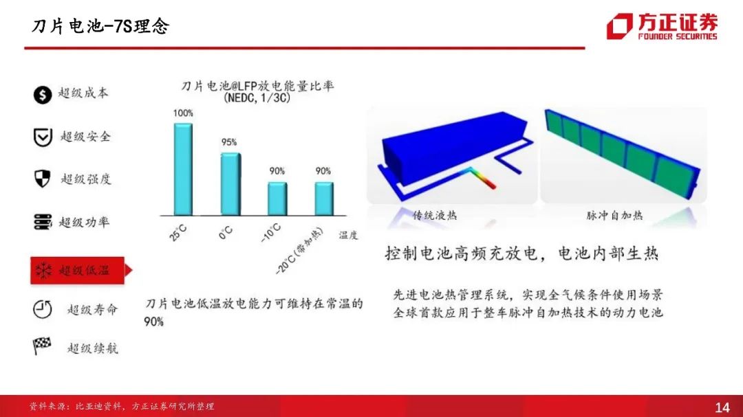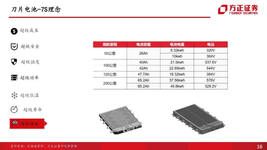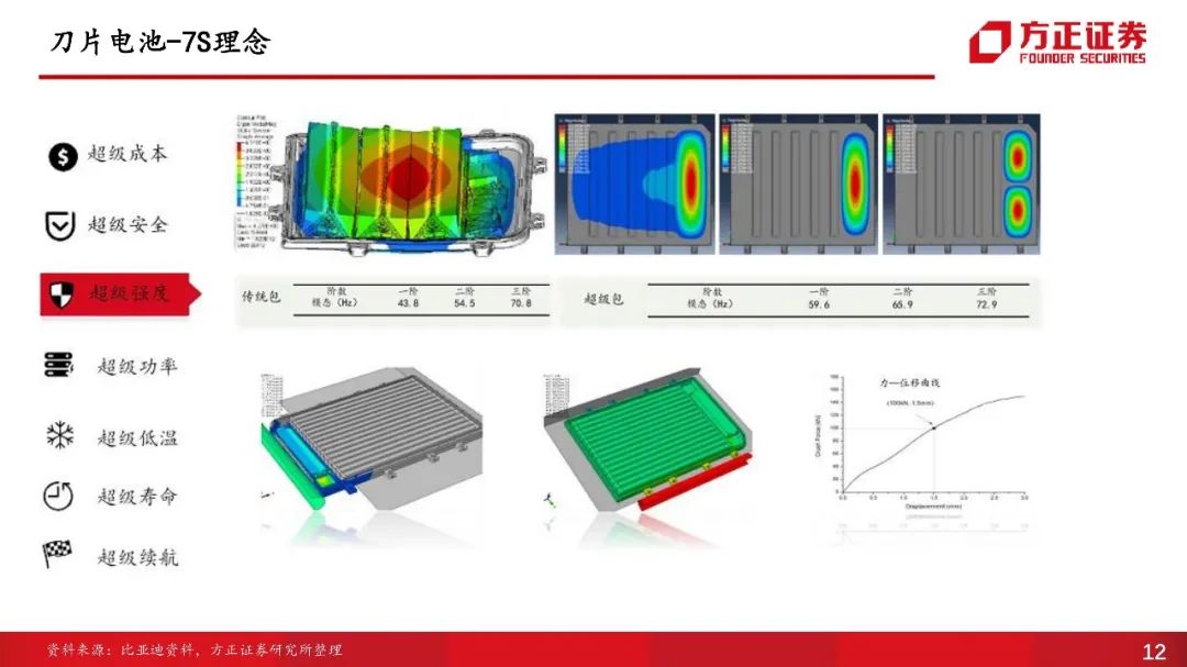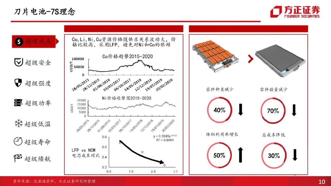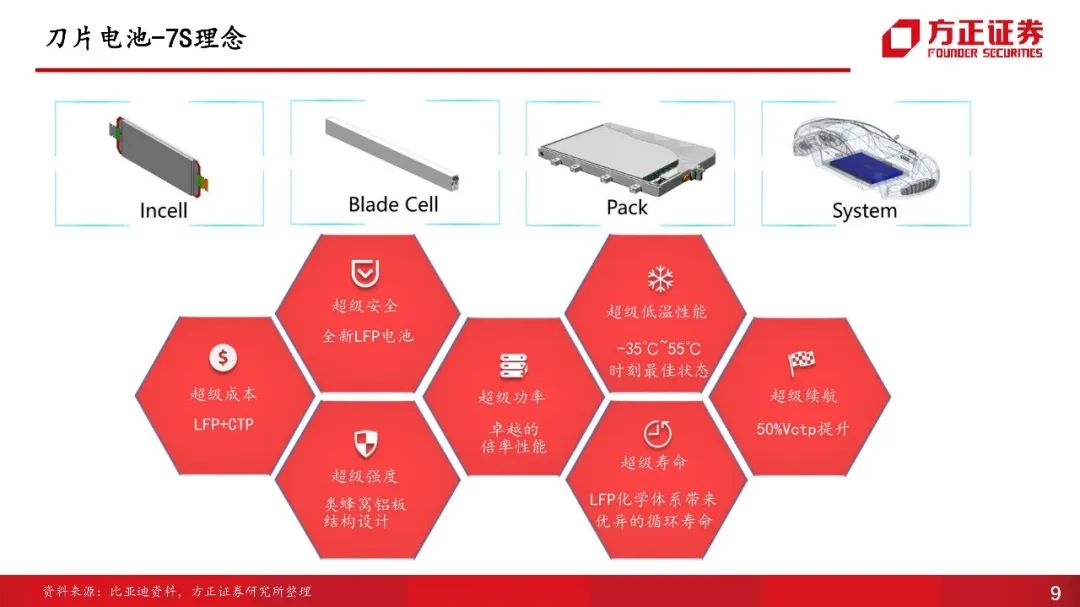 2、刀片电池成为安全的标志,特斯拉和国内友商纷纷采用。刀片电池7S开发理念:安全、成本、强度、功率、低温、寿命、续航,重新定义了新能源汽车的安全标准,高效成组极大降低电池系统成本。以前车企之间存在竞争关系,不愿意购买比亚迪电池,现在比亚迪新能源车的成功,相当于刀片电池最好的广告,特斯拉和国内车厂纷纷大量采购。