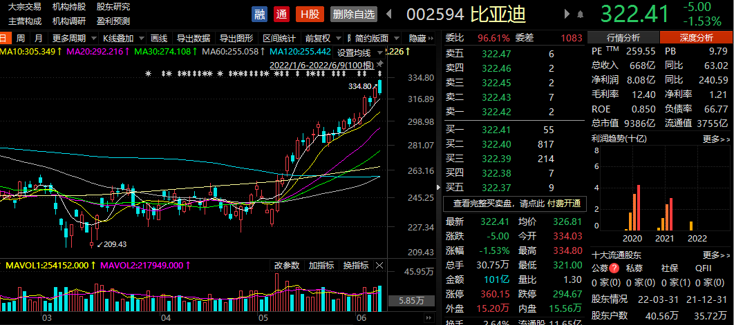 今日,比亚迪开盘涨2%,股价创历史新高,总市值逼近万亿。截至收盘,小幅下跌1.53%,总市值为9386亿元。