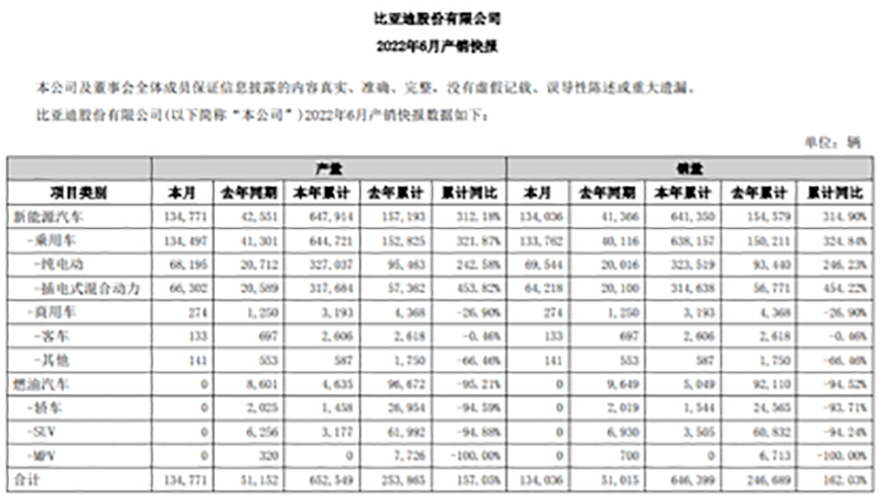 7月初,比亚迪明确超越特斯拉,登顶全球新能源汽车销冠。比亚迪2022年上半年新能源汽车销量64.14万辆,同比增长315%。而特斯拉2022年上半年全球交付量56.4万辆,较2021年上半年的38.62万辆同比增长46%。