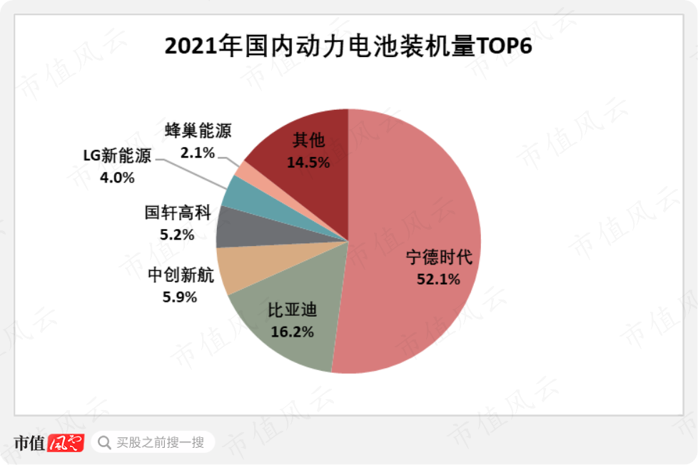 2021年宁德时代的国内动力电池装机量占比为52.1%,比亚迪为16.2%。这意味着过去半年里,宁德时代的国内市占率在去年的基础上下降了4.4个百分点,而比亚迪的市占率提高了5.4个百分点。