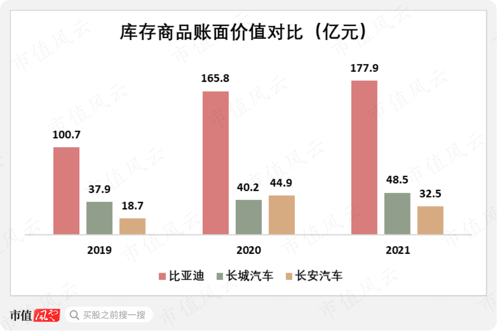 2021年比亚迪库存商品账面价值为178亿元,而长城与长安的库存商品账面价值分别仅为49亿元及33亿元。