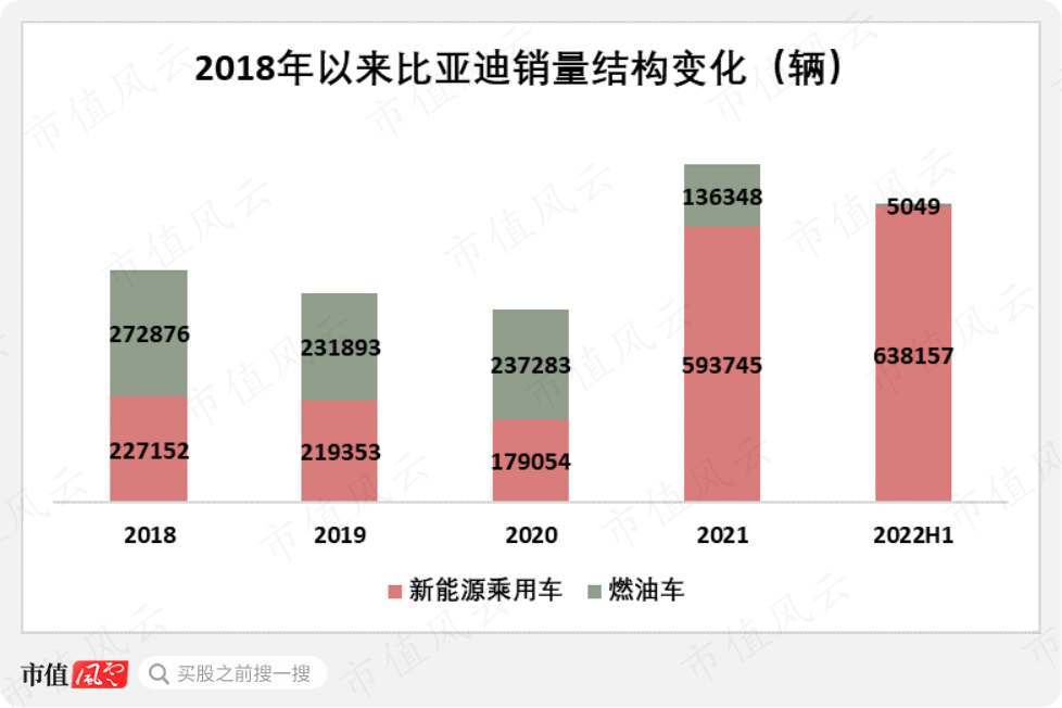 2018-2020年,比亚迪的燃油车年销量一直大于新能源车,直到2021年新能源车市的异军突起为其创造了良机,凭借“一套混动系统搭配不同车型”的打法,比亚迪的新能源车销量实现爆发。