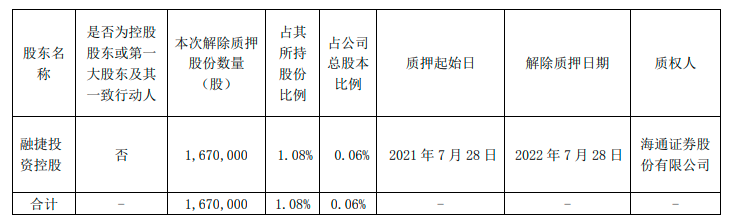 据悉,本次解除质押股份数量占其所持股份比例1.08%,占公司总股本比例0.06%,质权人为海通证券股份有限公司。
