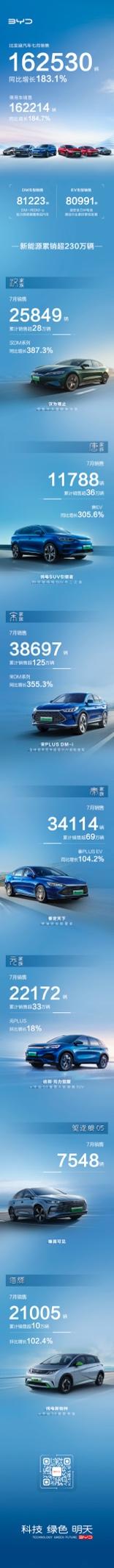 比亚迪,算得上是“突围大军中的一位名将”。日前,比亚迪发布7月份销量数据,比亚迪共售出汽车162,530辆,同比增长183.1%,其中乘用车销售162,214辆,同比增长184.7%,环比增长21.3%。