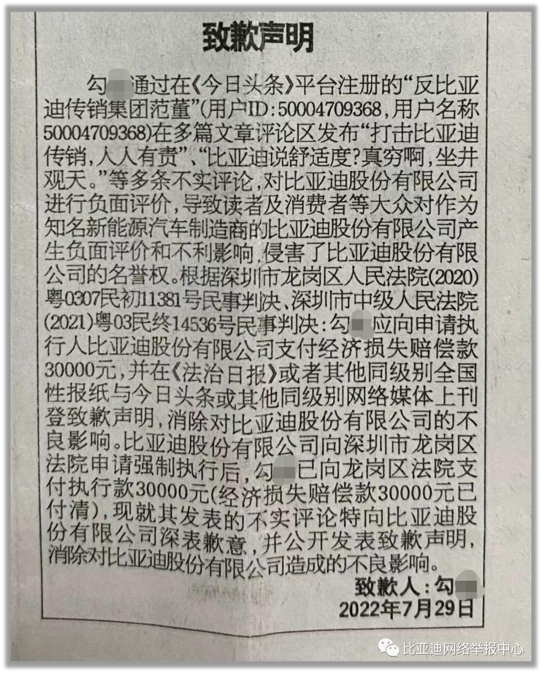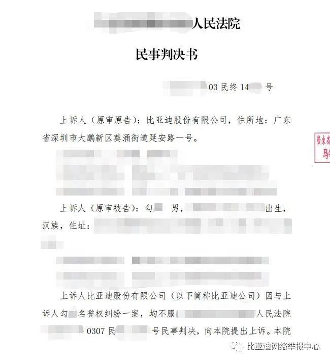 IT之家 8 月 12 日消息,今日,比亚迪网络举报中心发文表示,2022 年 4 月 12 日,比亚迪股份有限公司诉勾某(原今日头条账号“反比亚迪传销集团范董”,账号已注销)名誉权纠纷案件二审终审宣判后,勾某已在今日头条平台及《法治日报》第 13189 期公告专栏向比亚迪道歉,并支付赔偿款。